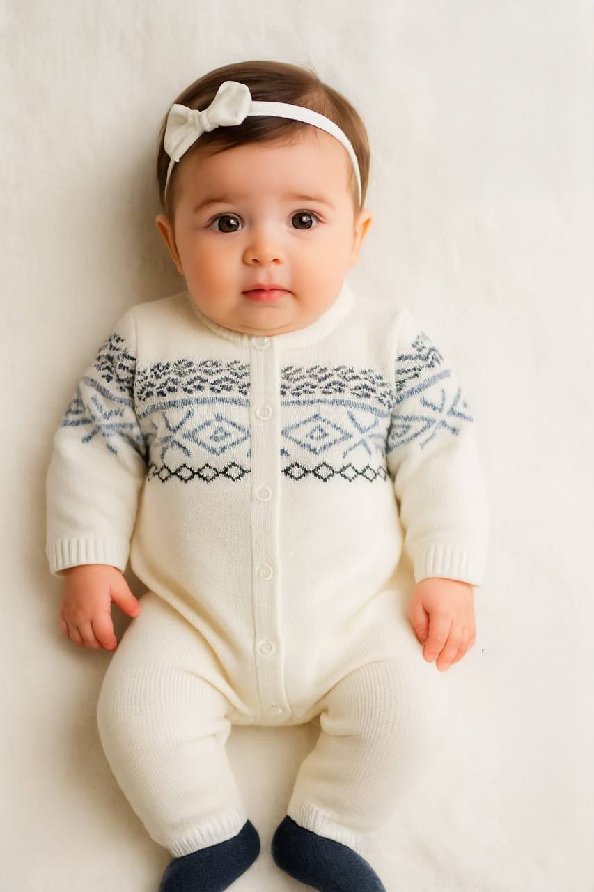 Long sleeves knitted jumpsuit designed with a vertical row of clean white buttons.