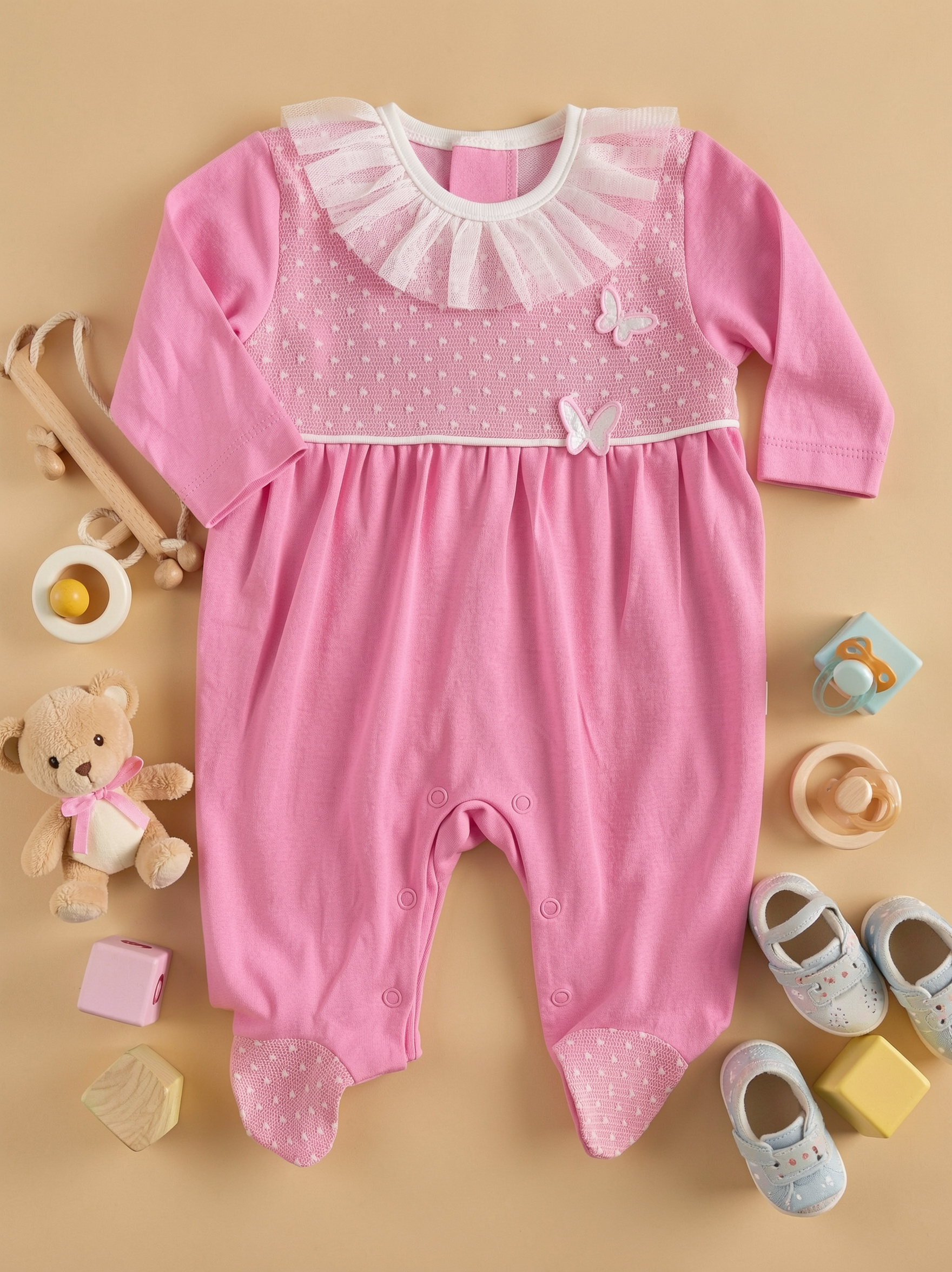 Long sleeves footed overall with easy-access snap buttons down the front for quick diaper changes and dressing.