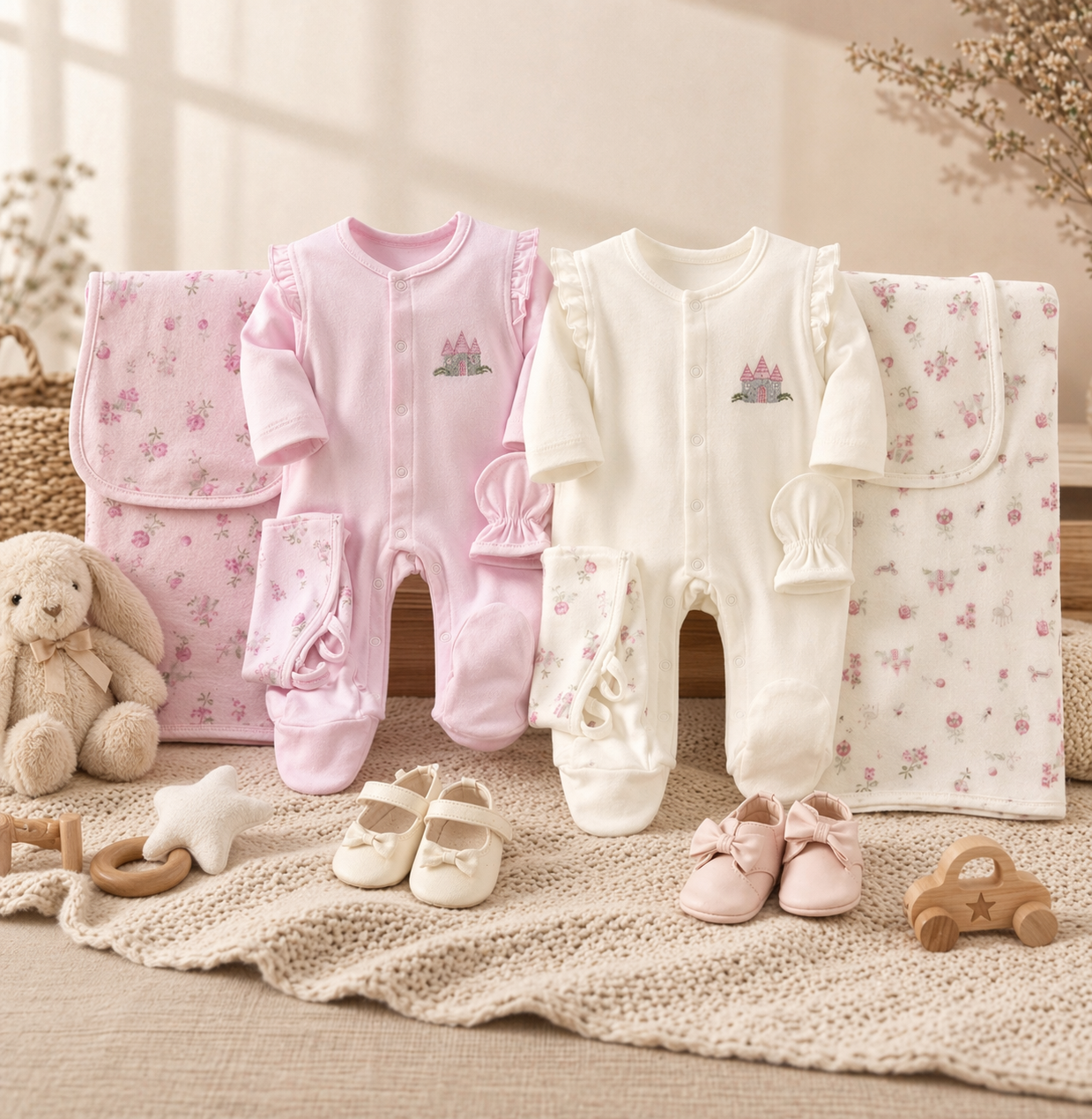 This 5-piece Enchanted Castle set combines vintage floral prints with soft ruffles for the ultimate newborn comfort.