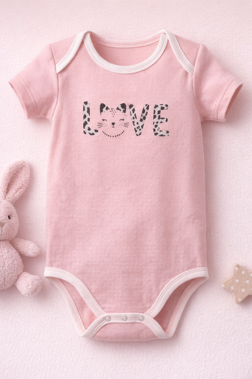 A cute and comfy Love Print baby girl bodysuit made from 100% soft, breathable cotton.