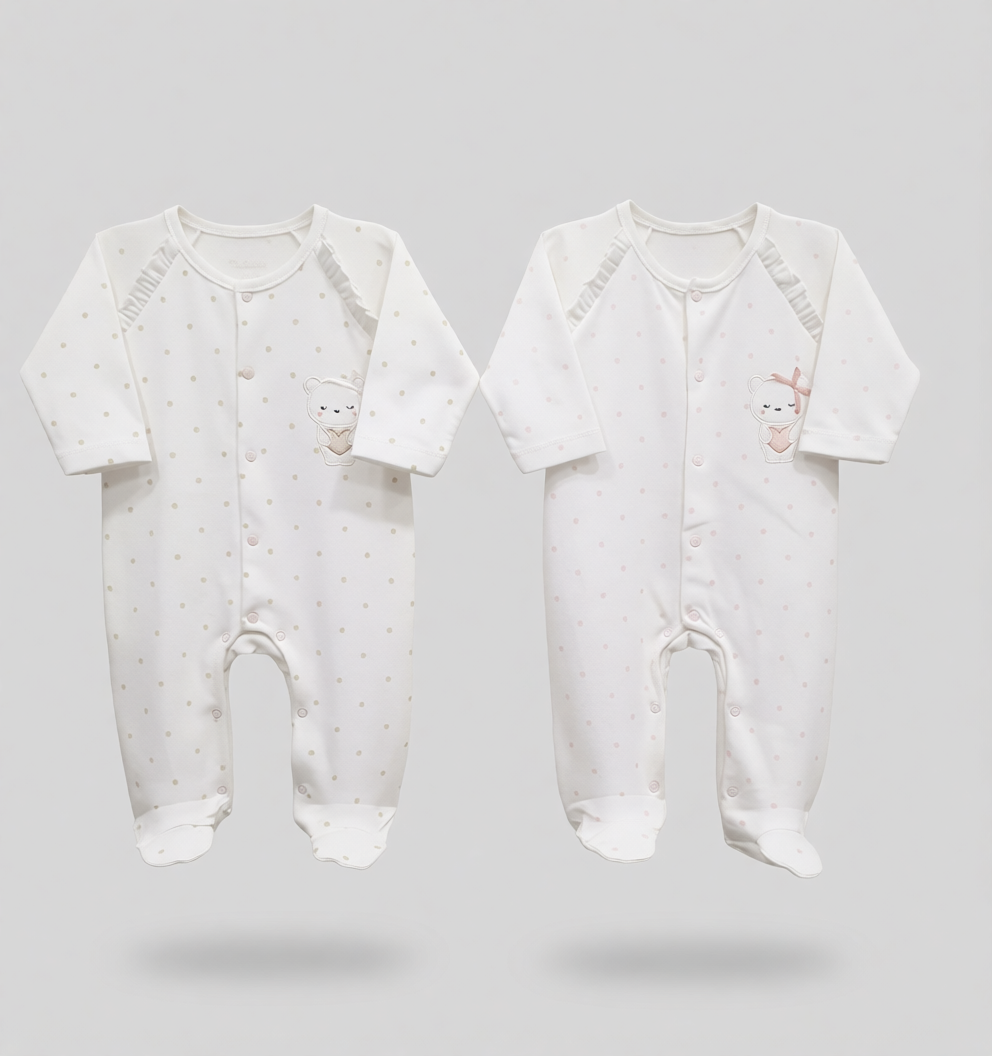 Long sleeves with integrated footies to keep tiny toes warm and ruffle trim along the shoulders for a touch of style. A full-length, snap closure from neck to toe makes diaper changes quick and easy.