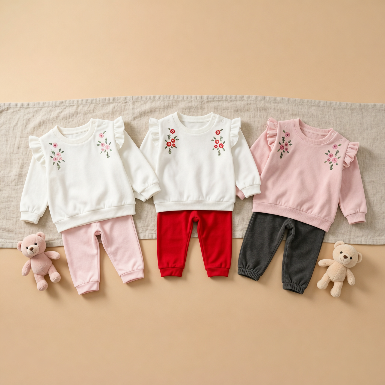 A floral embroidery sweatshirt with shoulder snaps. Paired with soft leggings.